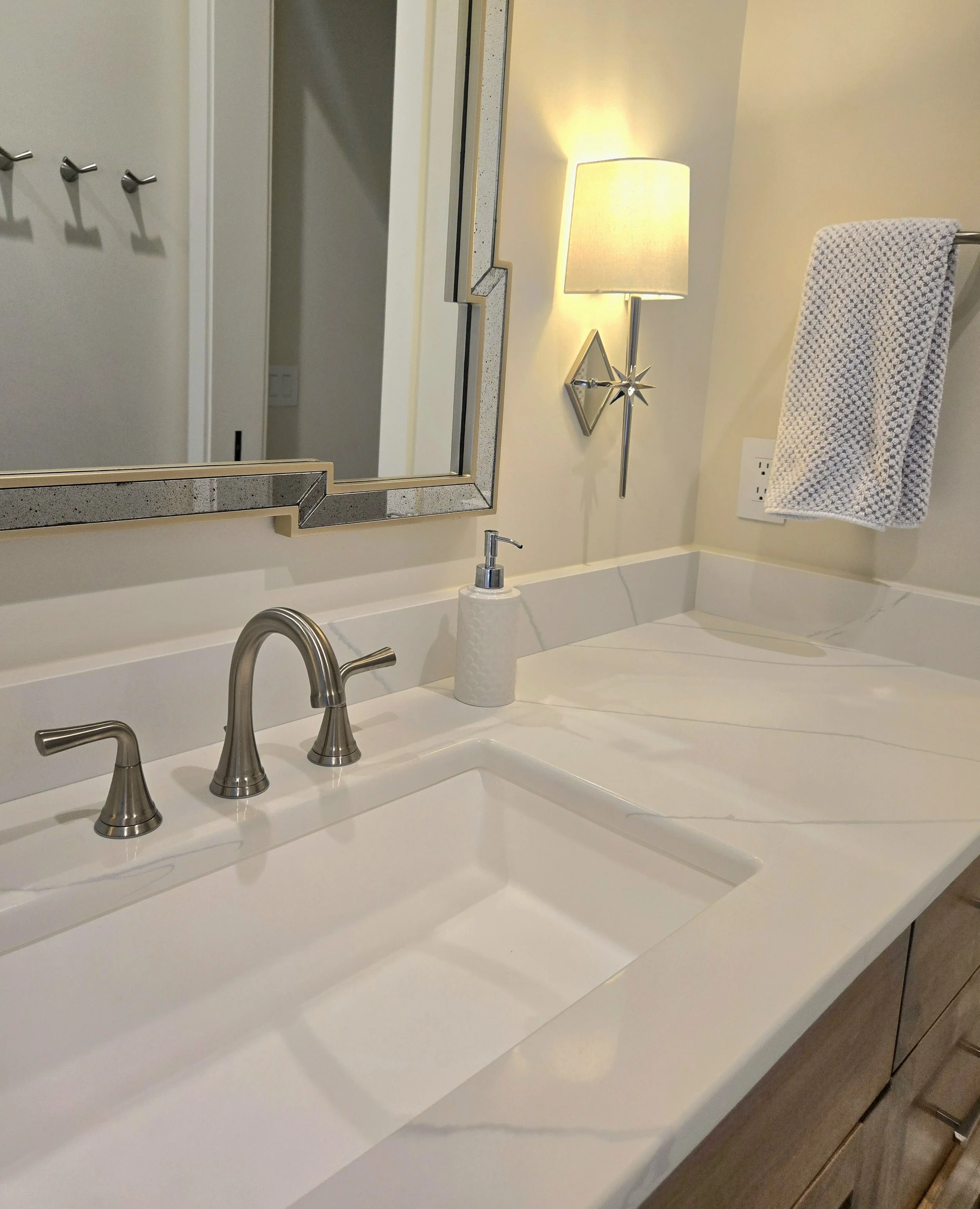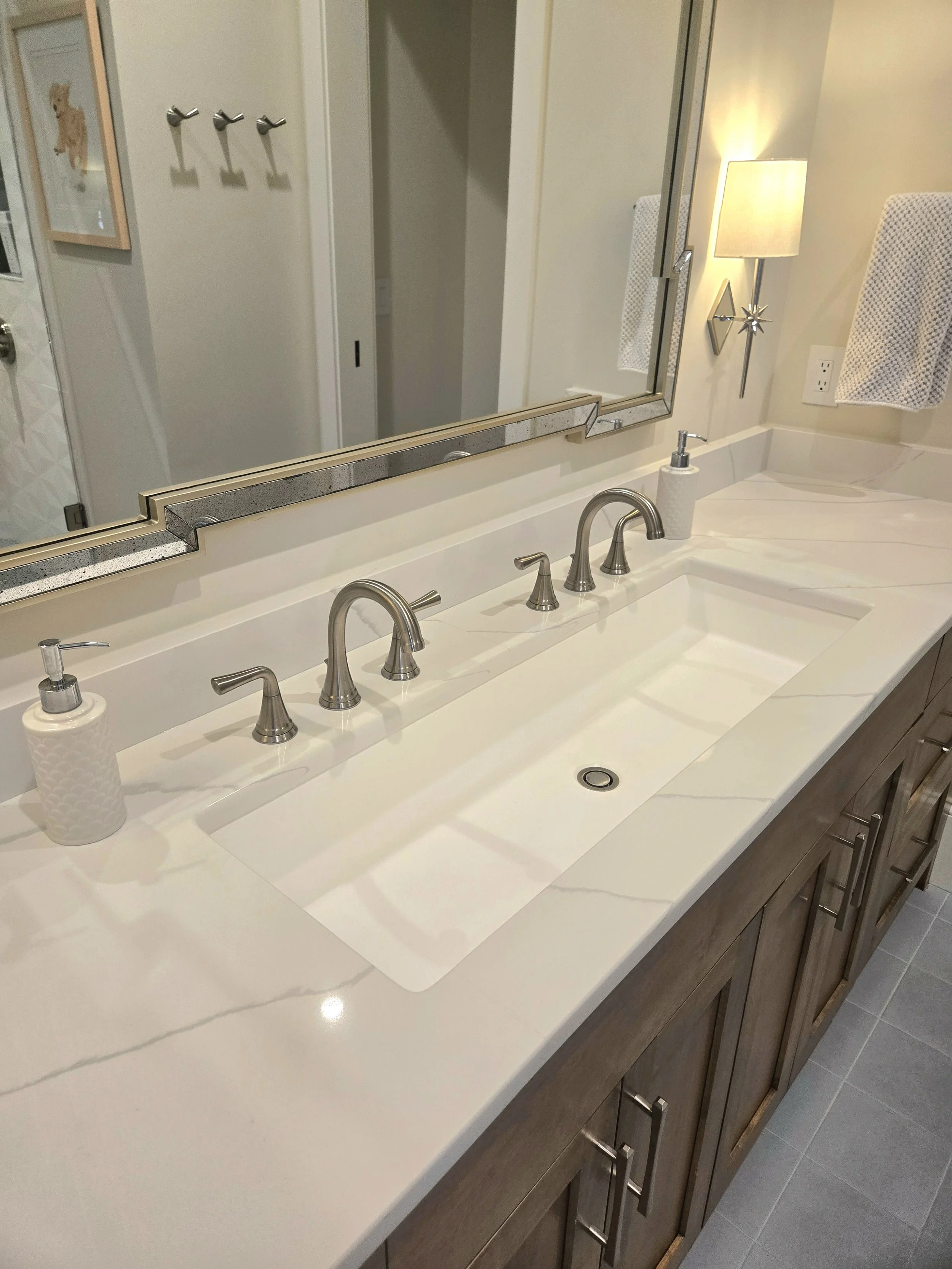 Two separate vanities would have visually crowded the room. More cabinetry. More bulk. More breaks in the line of sight.